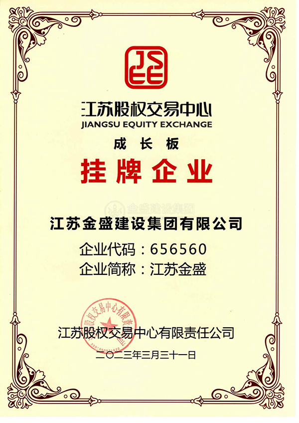 • 江蘇股權交易中心成長板掛牌企業(yè)資質證書